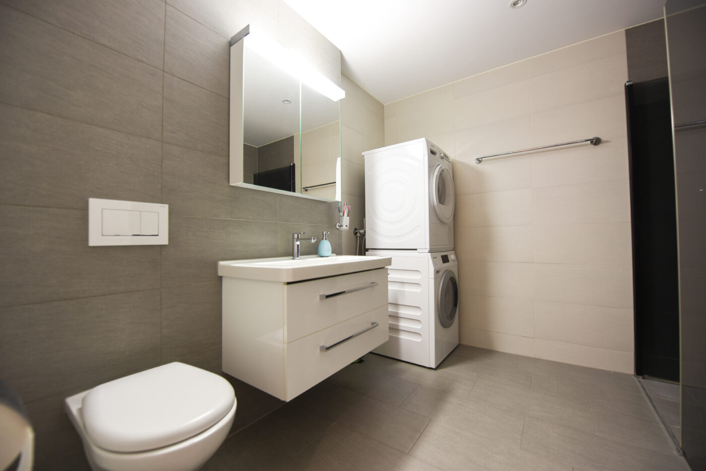 – Eine Nasszelle mit bodenebener Dusche, Lavabo mit Unterbaumöbel, WC und Waschturm